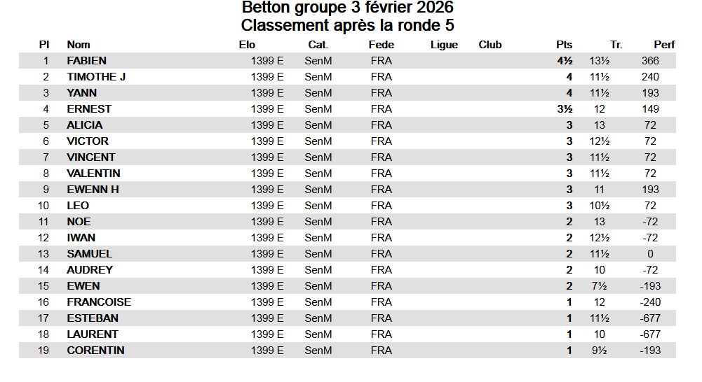 🥇 Fabien s’impose avec 4,5 points sur 5. Très solide tout au long du tournoi, il n’a concédé qu’une seule nulle à Ernest et termine seul en tête. Une performance remarquable !